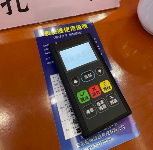 2、電子表決:會議電子表決系統(tǒng)的表決器,具有“贊成”、“反對”、“棄權(quán)”等按鍵鮮明,操作簡易,待機持久,會前反復(fù)測試,會中現(xiàn)場支持。特別適合于市、縣(區(qū))人民代表大會涉及表決事項時使用,數(shù)據(jù)準(zhǔn)確,能和大會主持詞、顯示屏同步協(xié)調(diào)使用,頗受“人代會”的歡迎和好評。